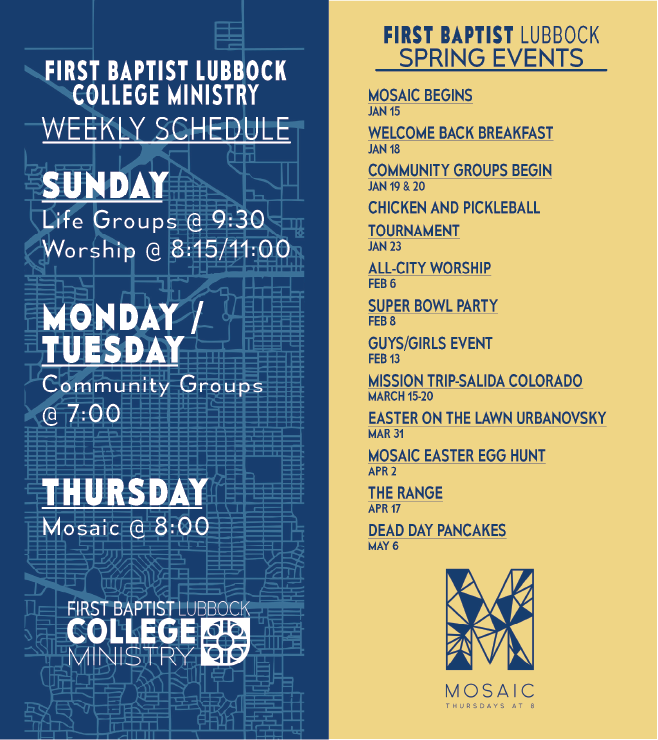 THE FIRST LUBBOCK COLLEGE MINISTRY IS PASSIONATE ABOUT LEADING STUDENTS TO LIVES THAT ARE MODELED AFTER JESUS. WEEK IN AND WEEK OUT, WE ACCOMPLISH THIS THROUGH MISSIONAL LIVING, EXPECTATIONAL WORSHIP, PASSIONATE TEACHING, AND COMMUNITY FELLOWSHIP.